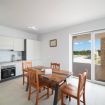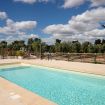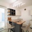 All’interno è presente un’ampia zona living dove troviamo un divano letto doppio, un comodo tavolo con sedie e una penisola con sgabelli e la cucina attrezzata, che dispone di lavello, frigo, piano a induzione e forno. Grazie a una luminosa vetrata, il soggiorno ha accesso diretto alla zona esterna e vista sulla piscina.