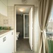 Una tenda separa la piccola area della cucina dove troviamo fornelli a gas, lavello, lavastoviglie e il bagno con doccia. Dalla cucina si accede a una riservata zona esterna dotata di tavolino con sedie.